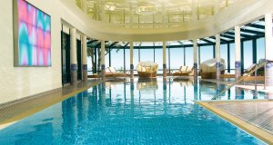 900 m² PURIA Spa-Landschaft mit Innenpool (Treppeneinstieg, 24 x 5 m), Saunalandschaft mit finnischer Sauna (90° C), Aromabad (60° C), Kristalldampfbad (50° C), Fitnessraum, Kursangebote. Alle Anwendungen finden auf Deutsch statt.