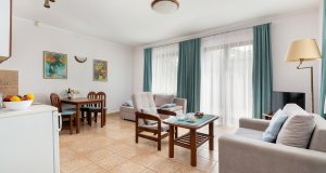 Apartment: ca. 48 m², 2-Räume: Wohnzimmer mit Schlafsofa und kleiner Küche, Schlafzimmer mit Ehebett.